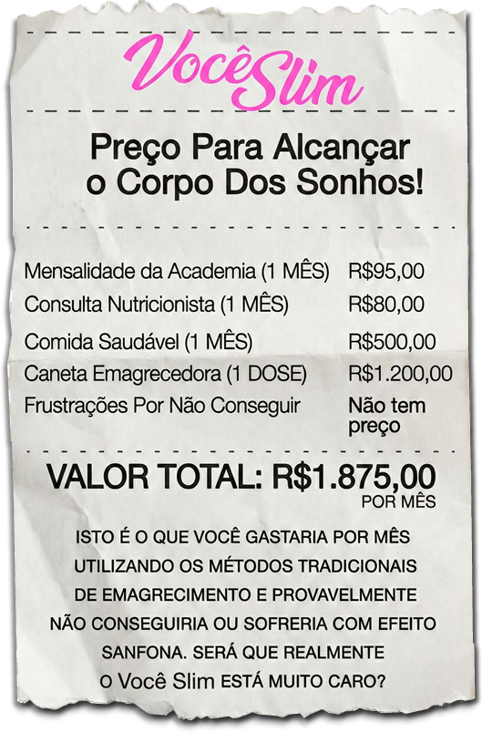 Com este valor por dia, você pode garantir até 40kg a menos em 8 meses de uso do Você Slim. Isso mesmo! Com apenas R$1,56 ao dia você pode adquirir o kit com 8 unidades do emagrecedor número 1 do Brasil, e entrar em forma de uma vez por todas.